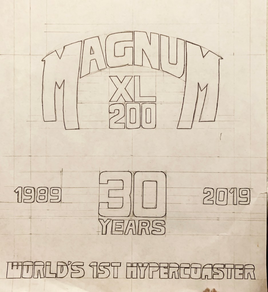 No….not a classic look. I needed to stick with the late 80’s timeline Magnum is rooted in. I wanted to use at least part of the logo and possibly entertain a font similar to the secondary logo on its ride entrance sign. (An 80’s style font with a line through it.) I also wanted to include the retro trains to give more depth. This was my final “sketch” before I started putting it together.