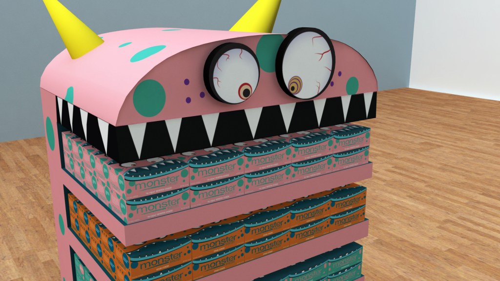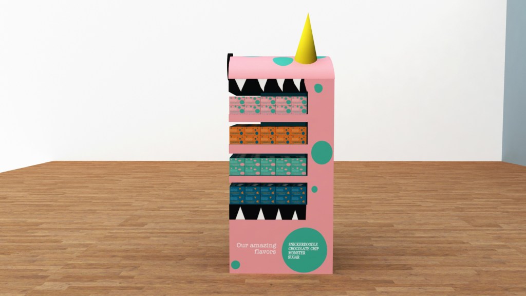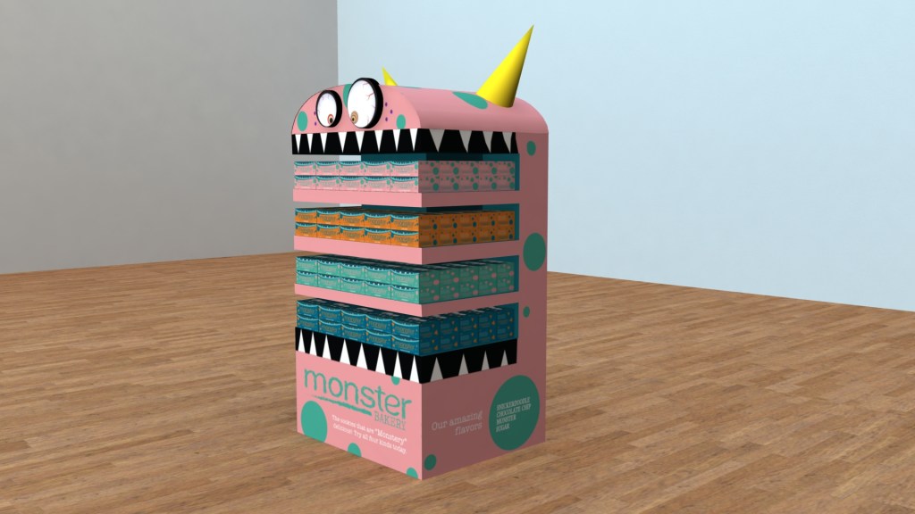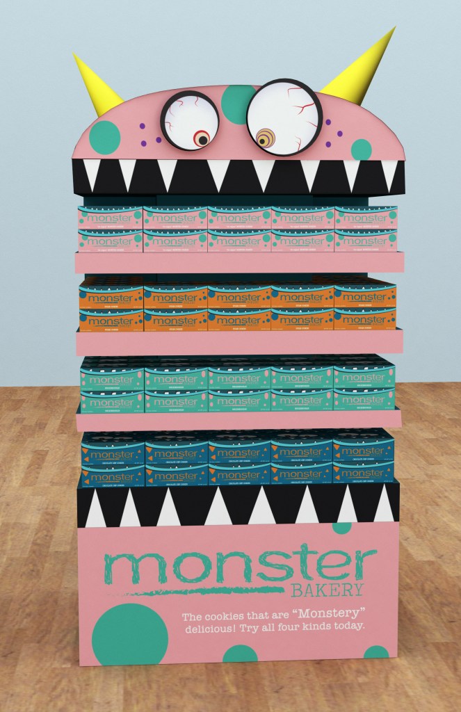 This is a complete branding project for an imaginary company called Monster Bakery. (Named after some pretty delicious monster cookies I bake on occasion.) I created a logo for the company, a backstory, and designed all the packaging for the product. There is also a CGI rendering of a store popup display and a small-scale model of a trade show booth section. I was branded under an umbrella corporation who specialized in packaged foods.