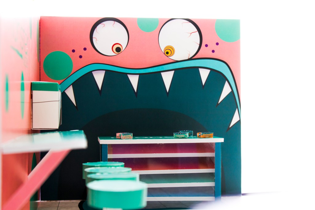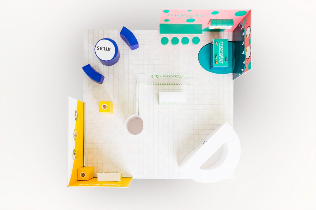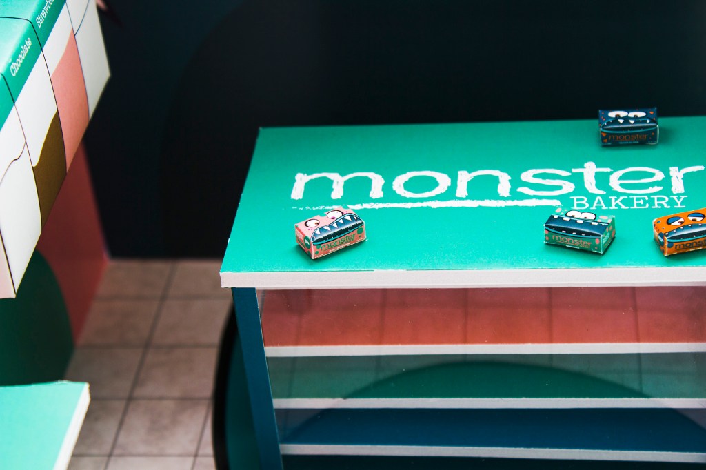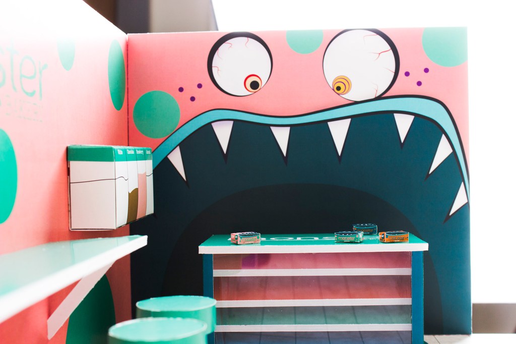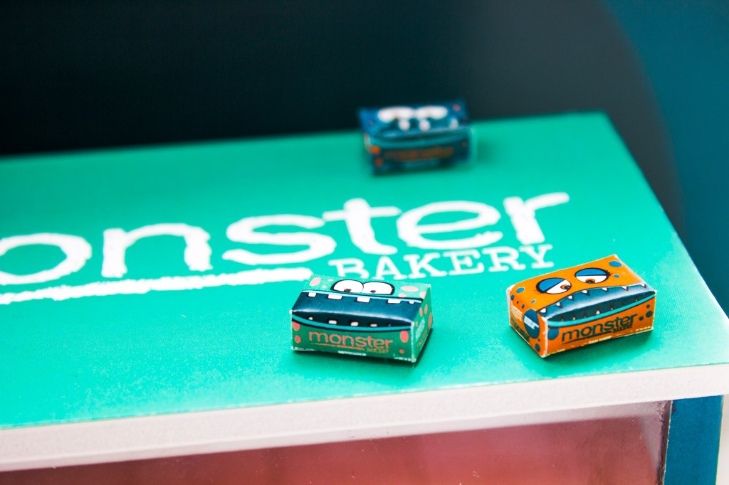 Here is the mini replica of the trade show booth under the parent company, Atlas. The Monster Bakery trade show booth includes free cookie samples, product packaging and a milk bar to give customers a way to wash down those delicious cookies.
