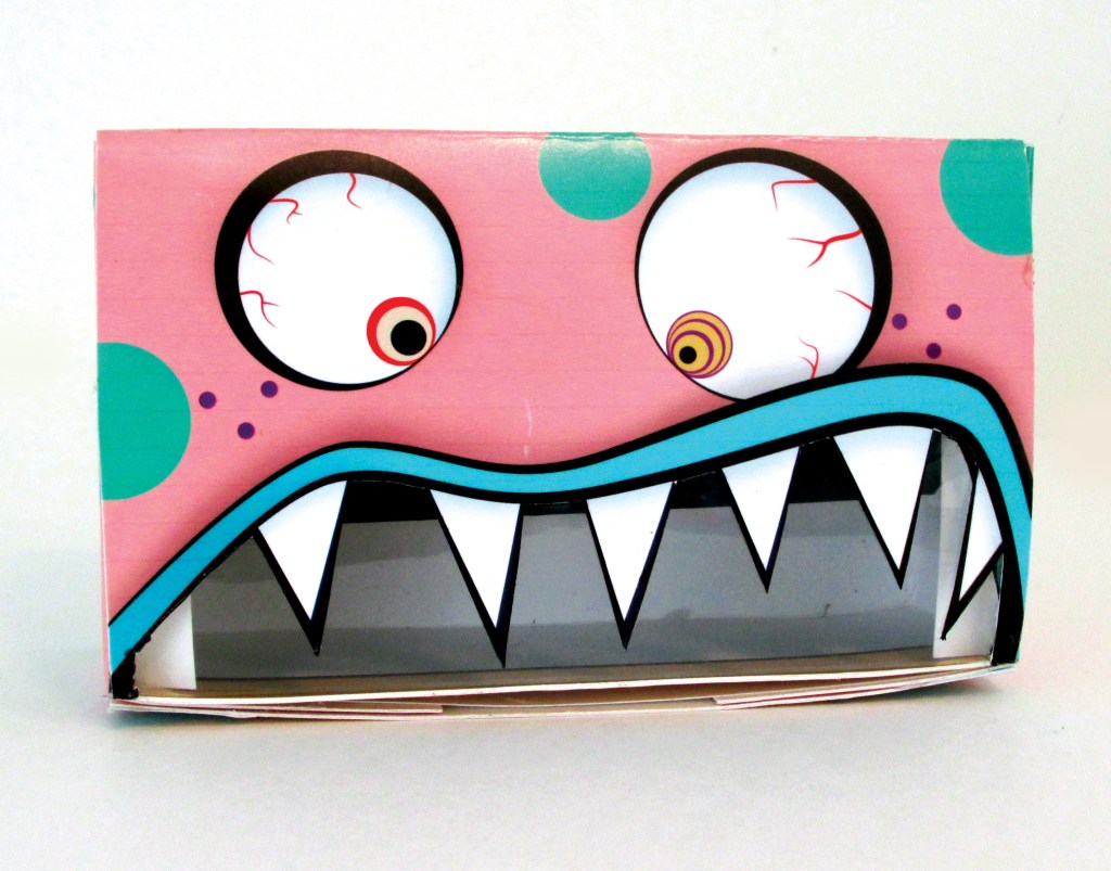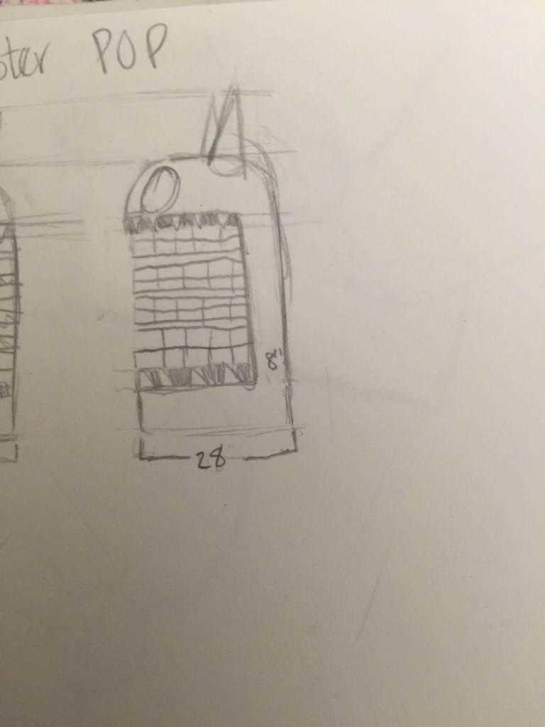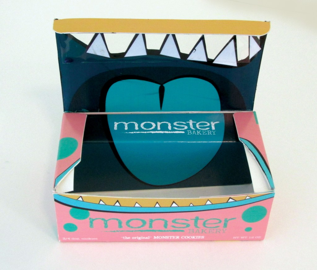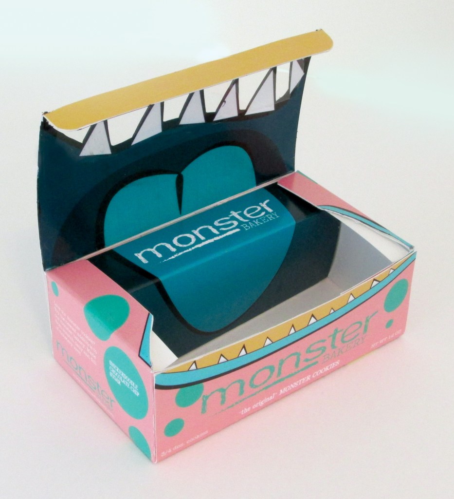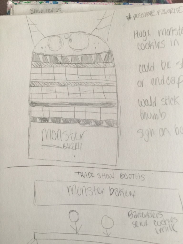 To the right is the initial sketch of what I wanted the packaging to look like. My biggest inspiration was the idea to package the cookies inside the monsters’ mouths.