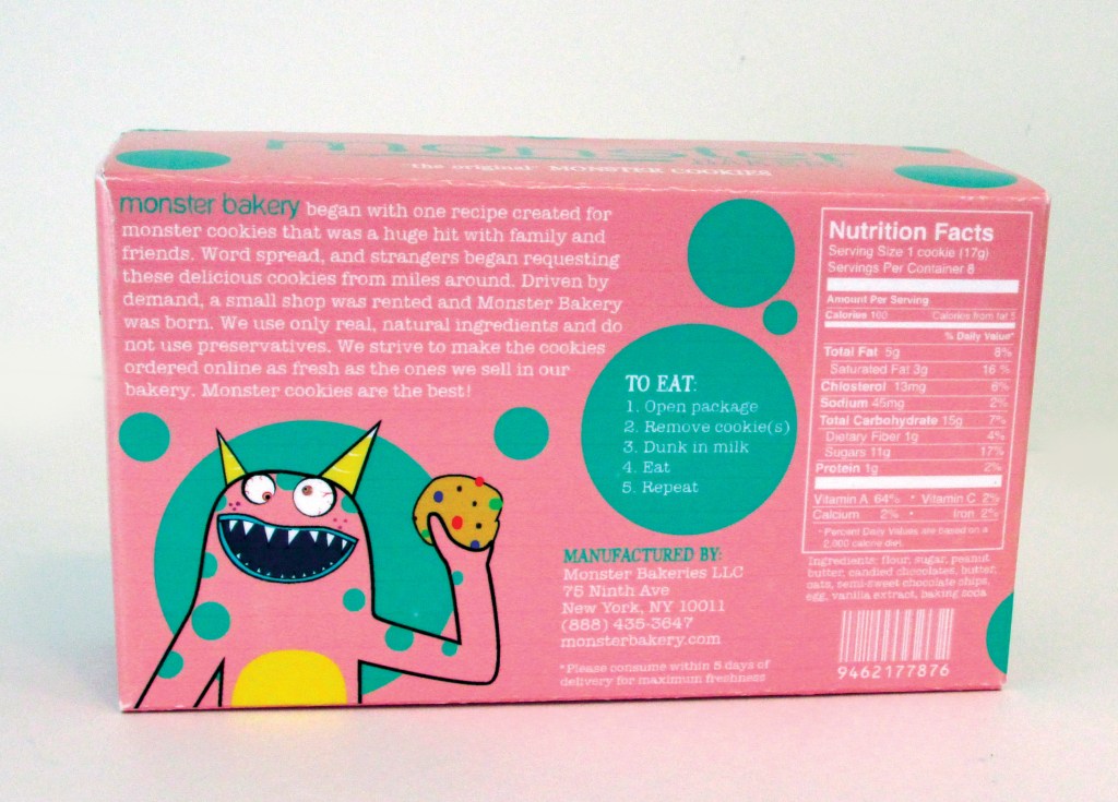 Here is the first look at the packaging for the company’s flagship Monster Cookies. Packaging is complete with nutrition label, backstory and barcode.