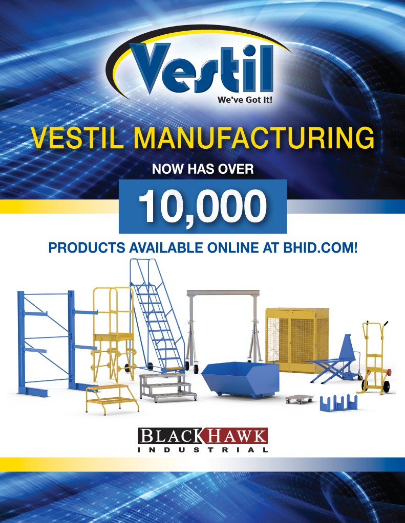 This is a a co-branded show flyer from 2018 I created for Vestil to advertise the new products added to Blackhawk Industrial’s website. It is special to me because this was the first advertisement created by Vestil featuring one of my CGI-rendered images. This was also the first product group photo I rendered completely from Solidworks models and features many built-to-order items all to scale with each other. All products shown are part of Blackhawk Industrial’s promoted Vestil line.
