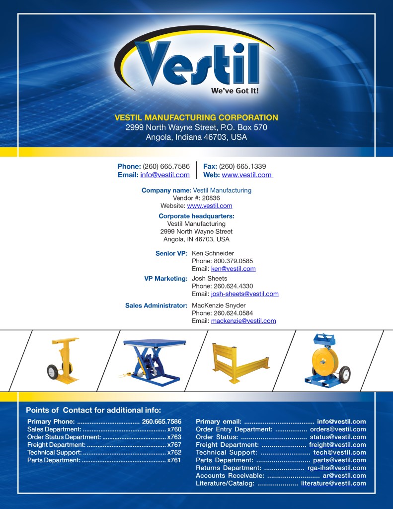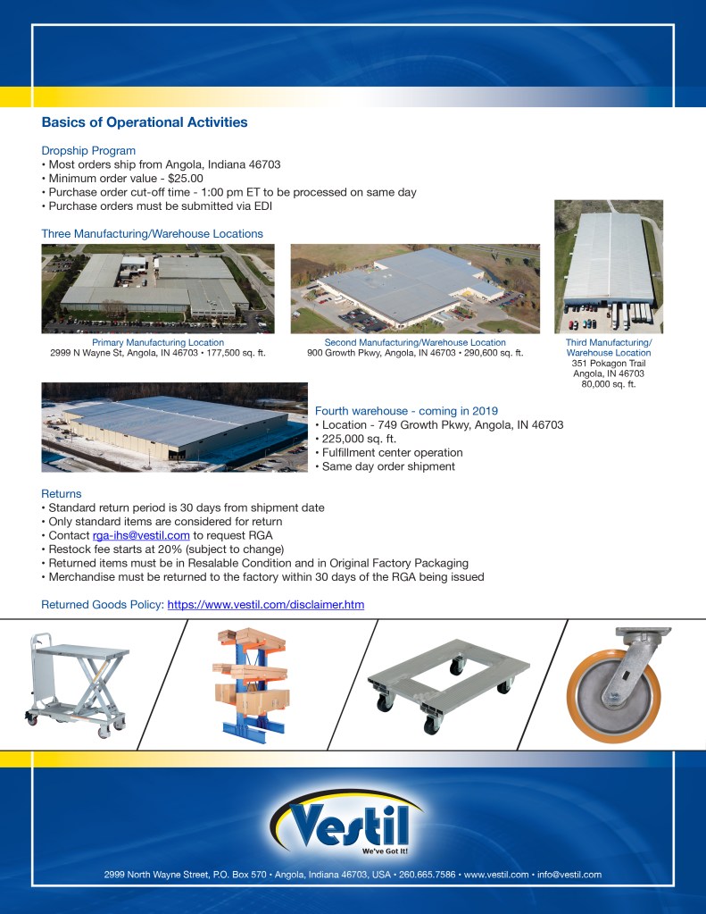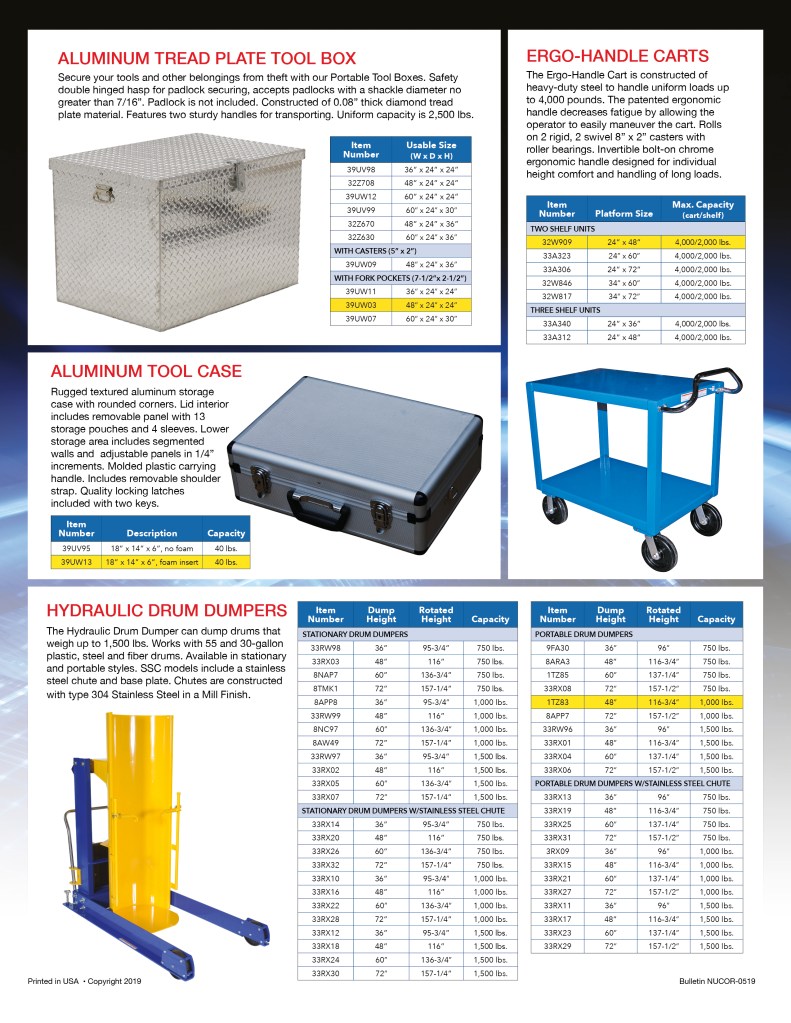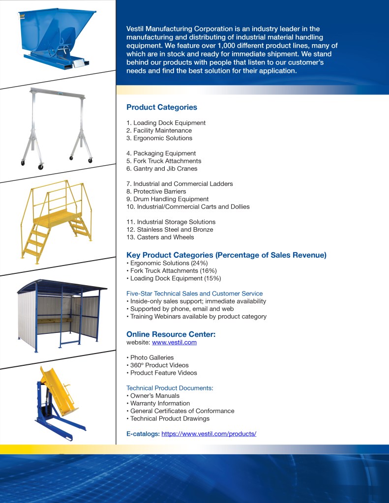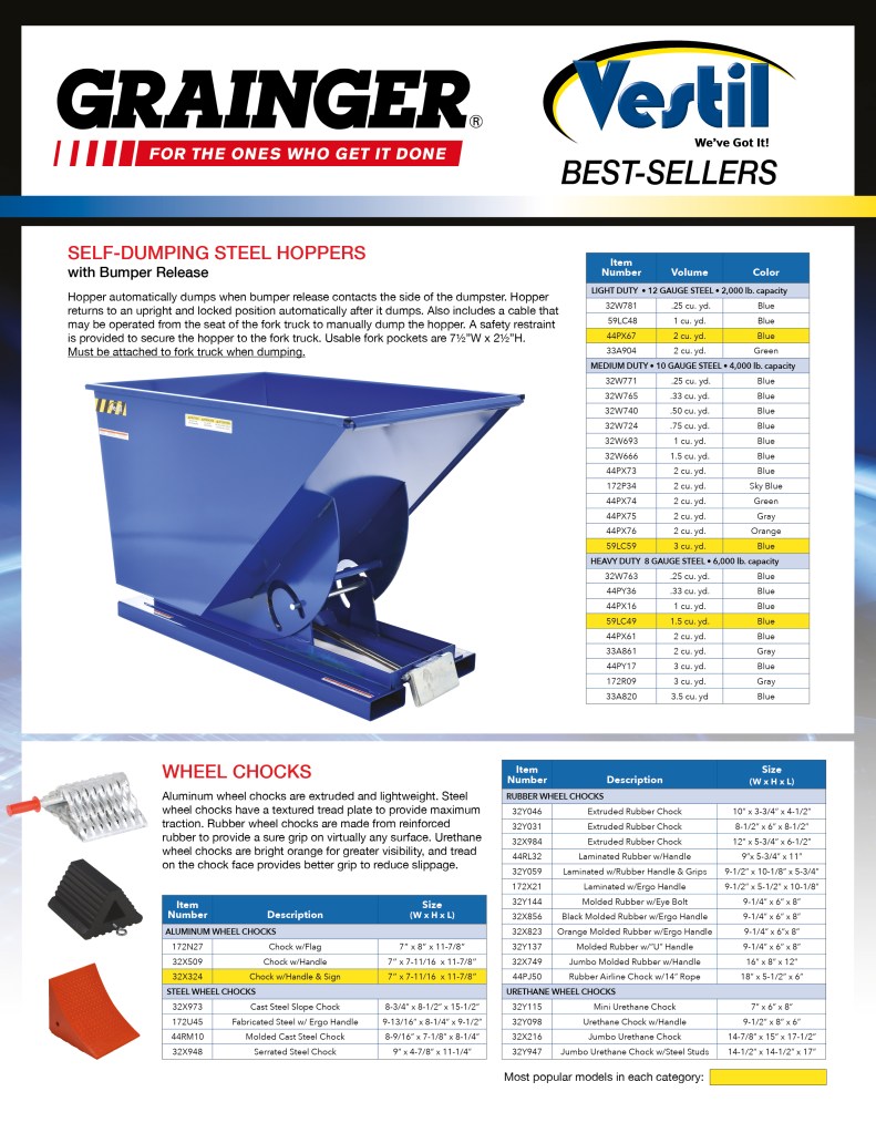 This is a two-sided flyer created for in 2019 for Nucor, one of Grainger’s subsidaries, that is highlighting Vestil’s best-sellers to Grainger. Grainger is not as specific as some of the other large distributors when it comes to the use of their logo and how we combine our branding with theirs, so this is more heavily branded towards Vestil’s preferred look. The headings throughout are all red to remind the viewer that this is a Grainger flyer. The rest of it includes Vestil blue in the table headers and their signature swirl background. The flyer was printed and distributed to the Nucor reps as a promotional piece.