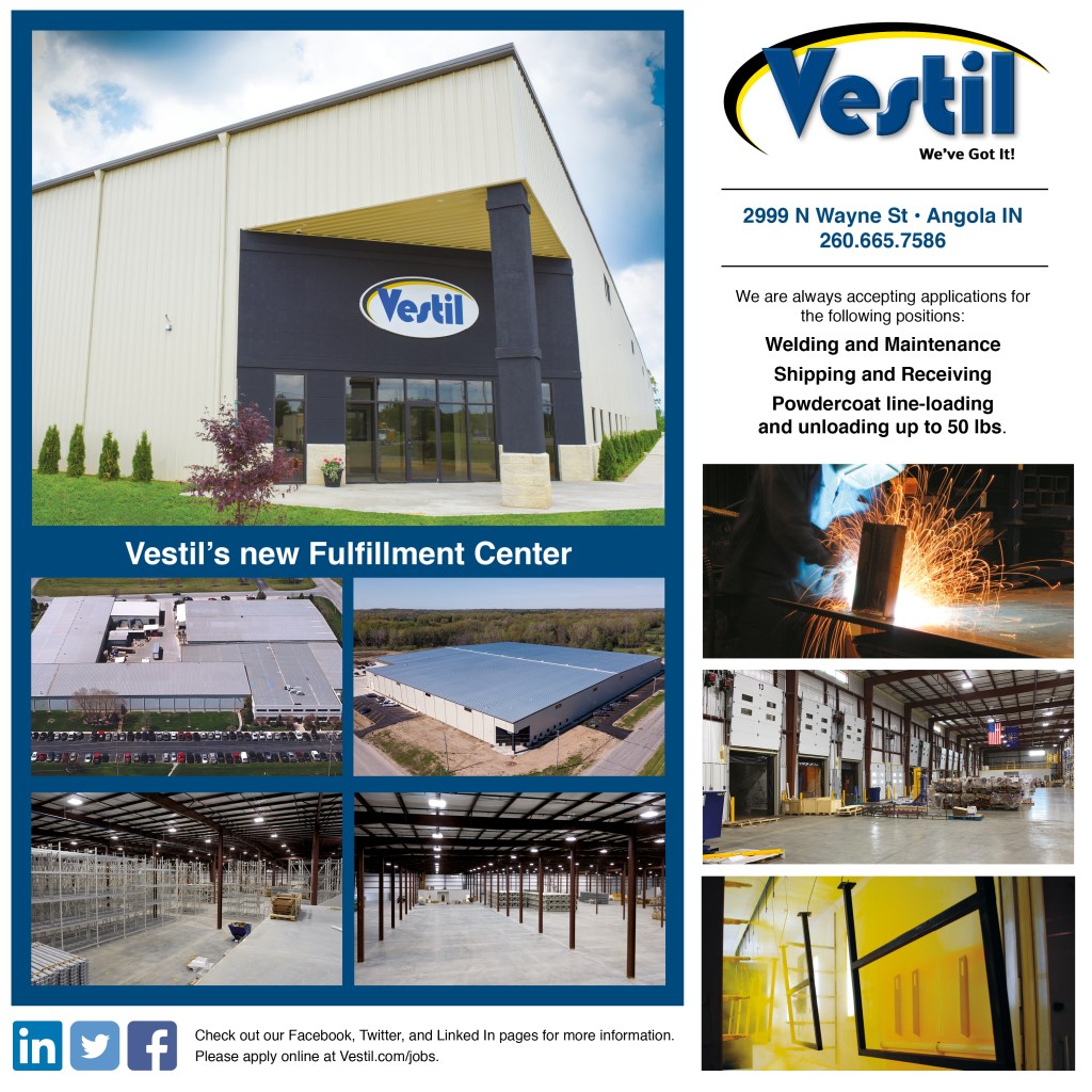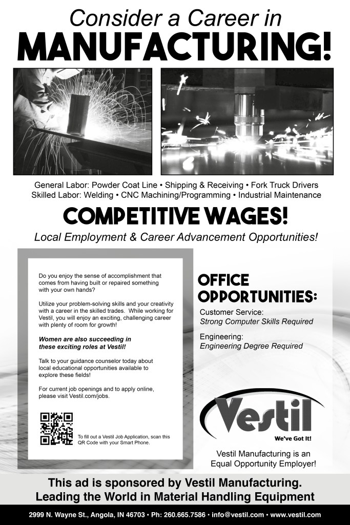 Vestil is always looking towards the future. They pride themselves on offering well-paying positions for people who choose trade school over college. This ad was ran in a local high school paper showing those opportunities as well as what college degrees can make a great career field. The ad is black and white but still features Vestil’s signature “swirl” background and bold typography to draw attention to each section.